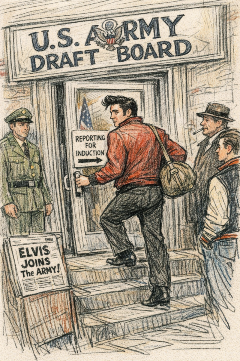 March 24, 1958 — Elvis Presley goes to the Memphis, Tennessee, draft board for his induction into the U.S. Army.